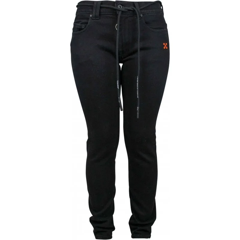Zwarte Off-White jeans.Witte diagonale strepen op de achterkant van de pijpen.Klein oranje Off-White symbool bovenaan de linkerpijp.Zwarte koordjes bij de sluiting aan de voorkant.Ritssluiting.