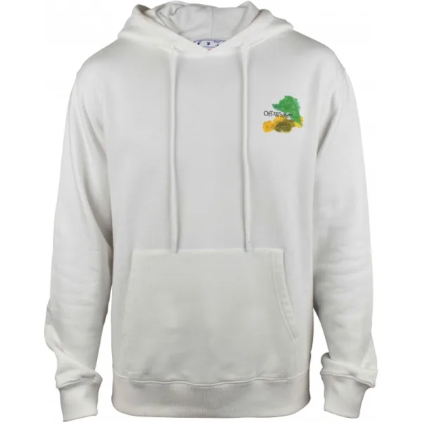 Witte gebroken witte katoenen sweater. Capuchon met trekkoord.Zwart logo gedrukt op de borst met gele en groene verfvlekken.Veelkleurige pijlen gedrukt op de rug met verfeffect.Kangoeroezak.Lange mouwen. Geribbelde randen.