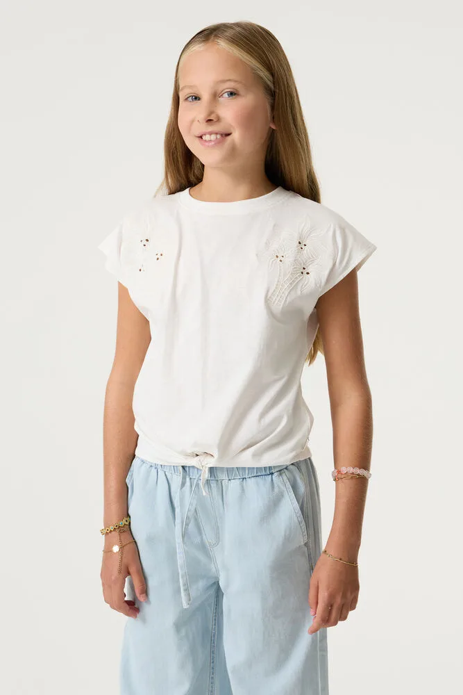 T-shirt met broderie anglaise. Dit T-shirt heeft een ronde hals, korte mouwen en een regular fit. Dit item is gemaakt van 50% katoen en 50% gerecycled katoen. Better Cotton is een initiatief dat zich wereldwijd inzet voor betere omstandigheden in de katoenindustrie. Hergebruik van materialen draagt bij aan een circulaire economie.