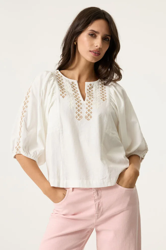 Blouse type: Blouseshirt; Design: Flare, Elastische taille/zoom, Pofmouwen; Materiaal: Katoen; Kraag: Zonder kraag; Details: Borduursels, Gedrapeerd; Extra's: Applicaties, Lichte stof; Pasvorm: Normale pasvorm; Armlengte: Driekwart mouw; Lengte: Normale lengte