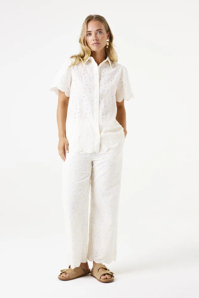Cropped broek met broderie anglaise. Een item als deze hoort thuis in elke damesgarderobe! Deze broek heeft een medium waist, een elastische tailleband en een relaxed fit. Dit item is gemaakt van 100% katoen. Better Cotton is een initiatief dat zich wereldwijd inzet voor betere omstandigheden in de katoenindustrie.