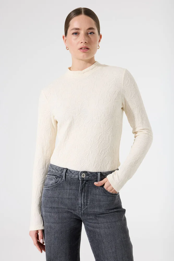 Longsleeve met jacquardstructuur. Deze longsleeve heeft een mock hals, lange mouwen en een regular fit. Dit item is gemaakt van 40% katoen, 38% polyester, 17% viscose en 5% polyamide.