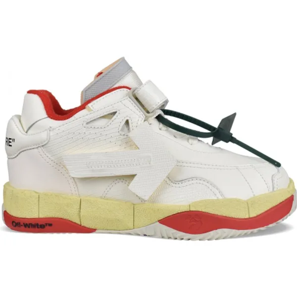 Gebroken witte Puzzle Couture sneakers van wit leer.Witte pijl aan de zijkant.Beige, rode en paarse rubberen zool met Off-White logo.Witte vetersluiting.Krassluiting op de enkel met Off-White logo.Iconisch groen label aan één kant.Toonblad met zwarte letters Haute en Couture .