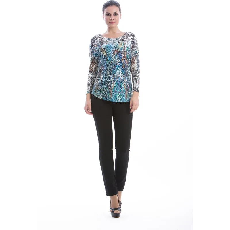 Top CONQUISTA in kantpatroon van viscose-elastan. Ronde hals en lange mouwen. Wijd aan de bovenkant en een ronde halslijn. Het model is 1.77m en draagt maat 36/S. 92% viscose-8% elastan