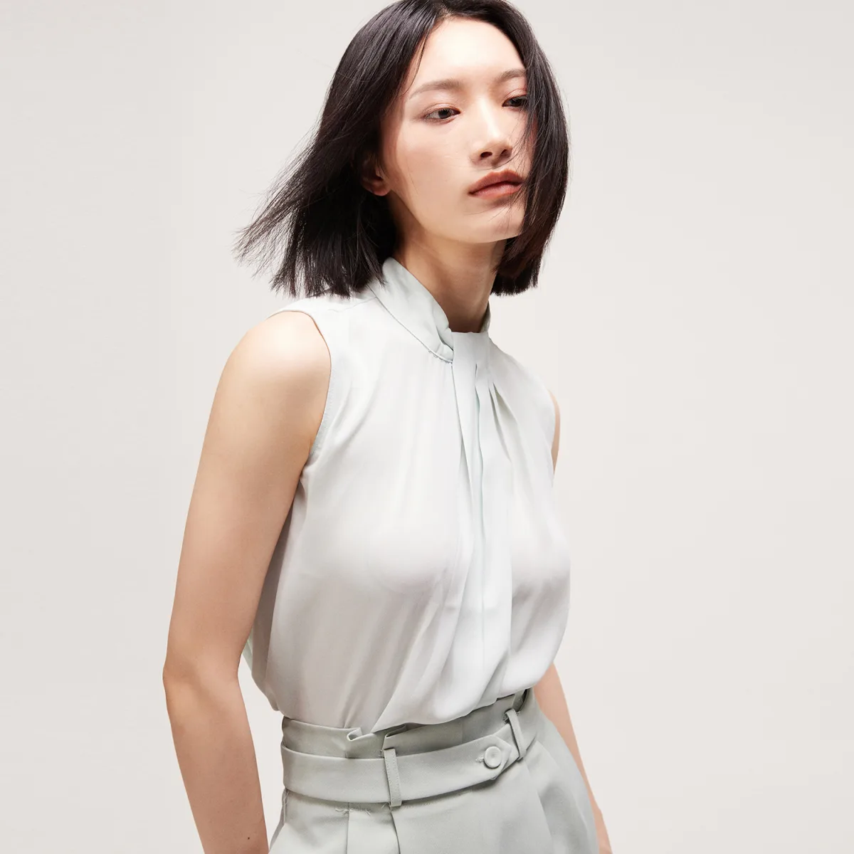 Een mouwloze blouse met een gordijn vanaf de hoge kraag. Voor een elegante look, een beetje BCBG, combineer deze top met een blazer en een rok met hoge taille of broek. Ook gedragen met eenvoudige jeans voor een meer casual look. Productdetails • Vorm: recht • Lengte: 60 cm • Hoge kraag • Mouwloos • Twee knoppen kraag midden terug