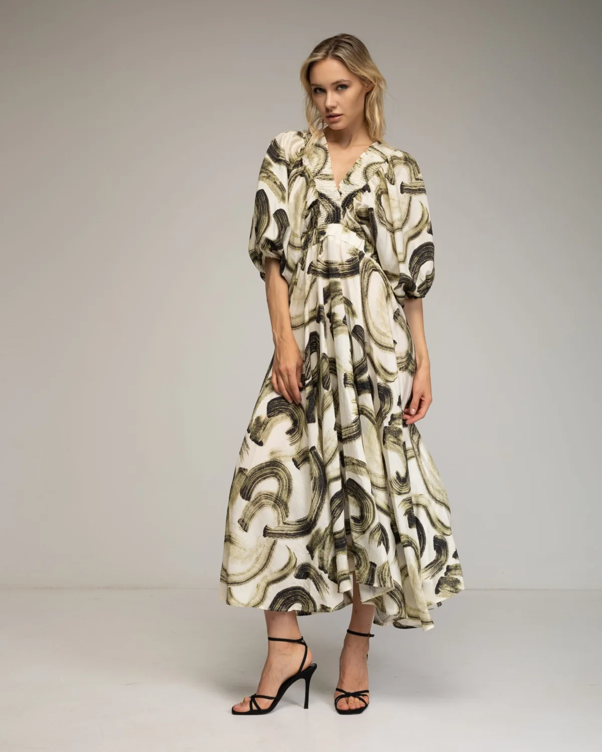 Maxi-jurk met puffed mouwen, gerimpelde V-hals en elastische tailleband