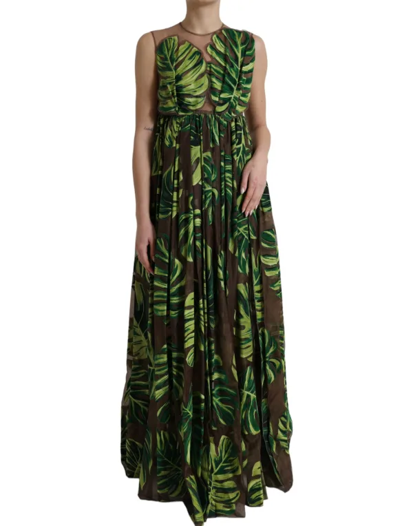 Gedrukte Zijde Maxi Jurk Tropisch Bladprint