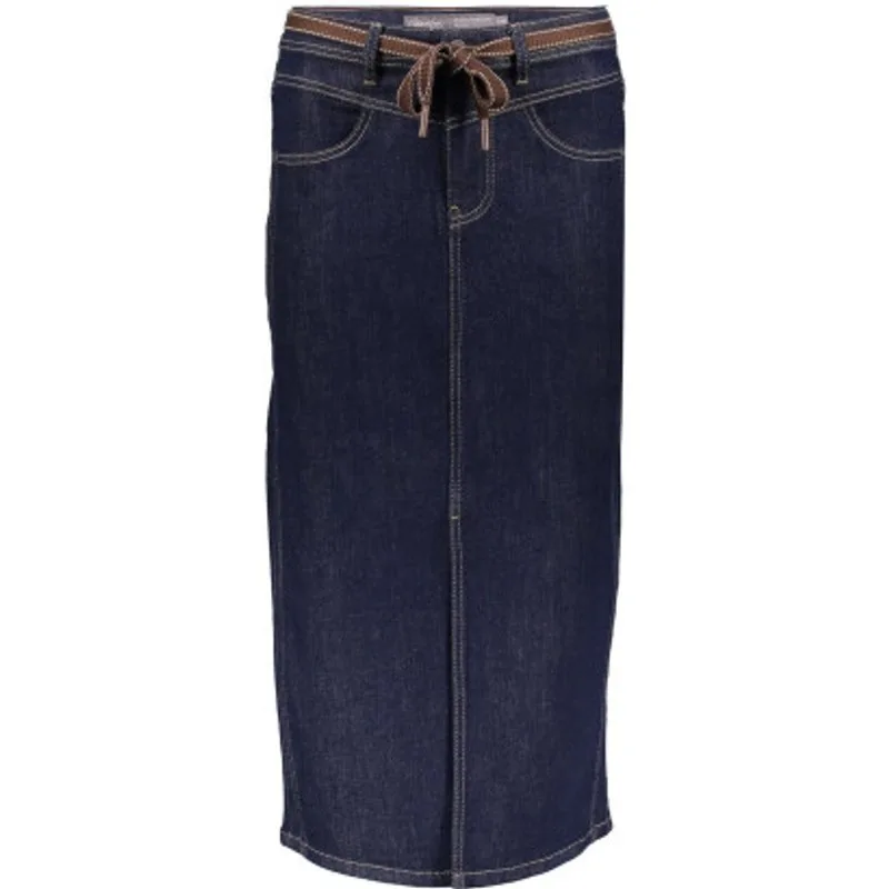De Jeansskirt (46800-10) van GEISHA is een rok met hoge taille met riemlussen en strikkoord. Dit model heeft een knoop- en ritssluiting, steekzakken aan de voorkant en een split. De rok is heeft een recht model, valt tot halverwege het scheenbeen en is uitgevoerd in de kleur Darkblue denim.De stof is gemaakt van een zacht denim kwaliteit