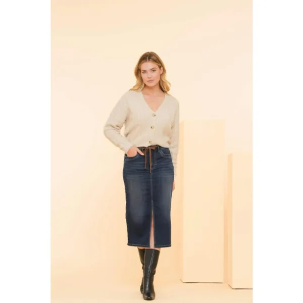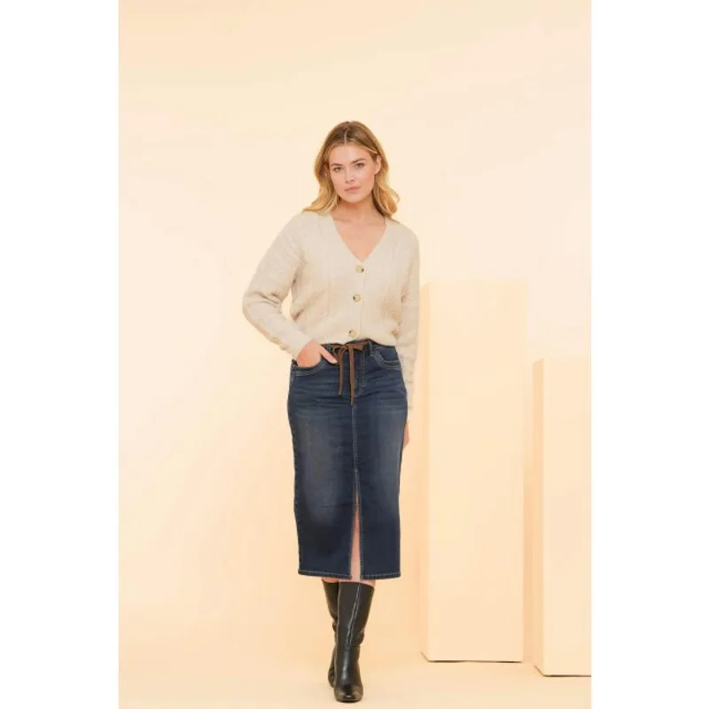 De Jeansskirt (46810-10) van GEISHA is een rok met hoge taille met riemlussen en strikkoord. Dit model heeft een knoop- en ritssluiting, steekzakken aan de voorkant en een split. De rok is heeft een recht model, valt tot halverwege het scheenbeen en is uitgevoerd in de kleur Grey denim. De stof is gemaakt van een zacht denim kwaliteit