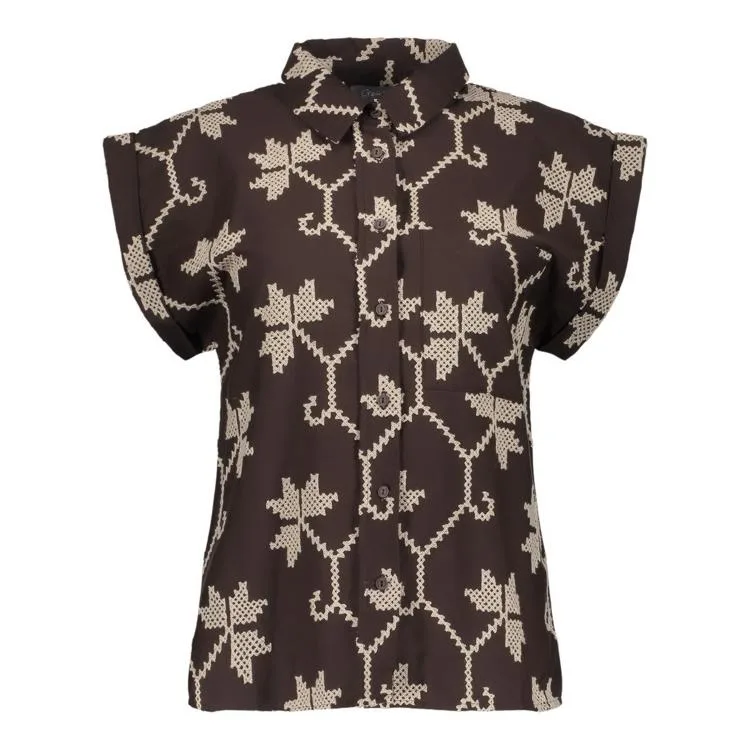 Deze damesblouse is gemaakt van een zachte, geweven kwaliteit met een soepele, luchtige feel. De kleine opstaande kraag en de halve knoopsluiting geven een verzorgde uitstraling. De korte mouw heeft een vaste omslag; de pasvorm valt recht en comfortabel. Het all-over bladdessin in contrasterende tinten op een donkere basis oogt grafisch en elegant. De blouse heeft een rechte zoom, geen zakken en geen opvallende logo's. Een veelzijdig kledingstuk van Geisha binnen Dames, Blousen & Tunieken dat je moeiteloos combineert in elk seizoen.