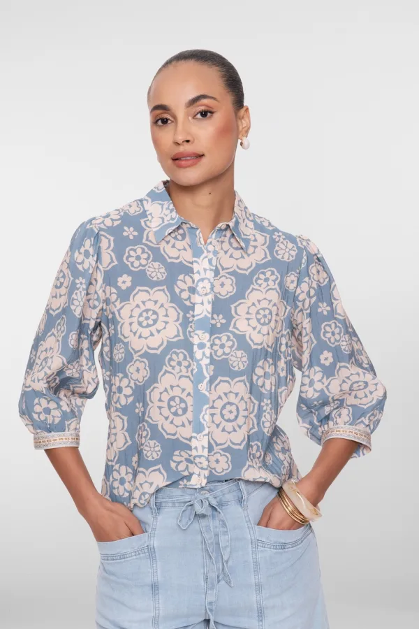 Deze blauwe blouse van Geisha heeft een lichtblauw en ecru bloemendessin met print. Het rechte model heeft een normale pasvorm, een kraag en een knoopsluiting. De 3/4-mouwen zijn afgewerkt met een biesje en knoopdetail. De mix van viscose en polyamide geeft de blouse een verzorgde uitstraling. Mooi te combineren met een effen broek of rok voor een rustige, zelfverzekerde stijl.
