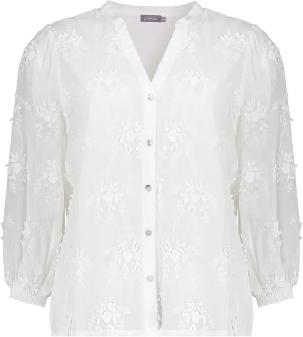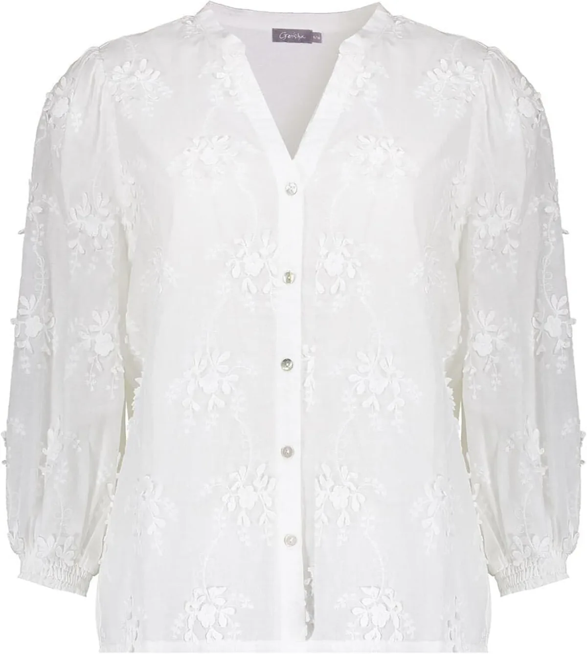 De blouse van Geisha is een vrouwelijke casual blouse met een opstaande kraag, V-hals en knoopsluiting. De 7/8 mouwen zijn voorzien van elastische manchetten en een all-over patroon, perfect voor elke gelegenheid.