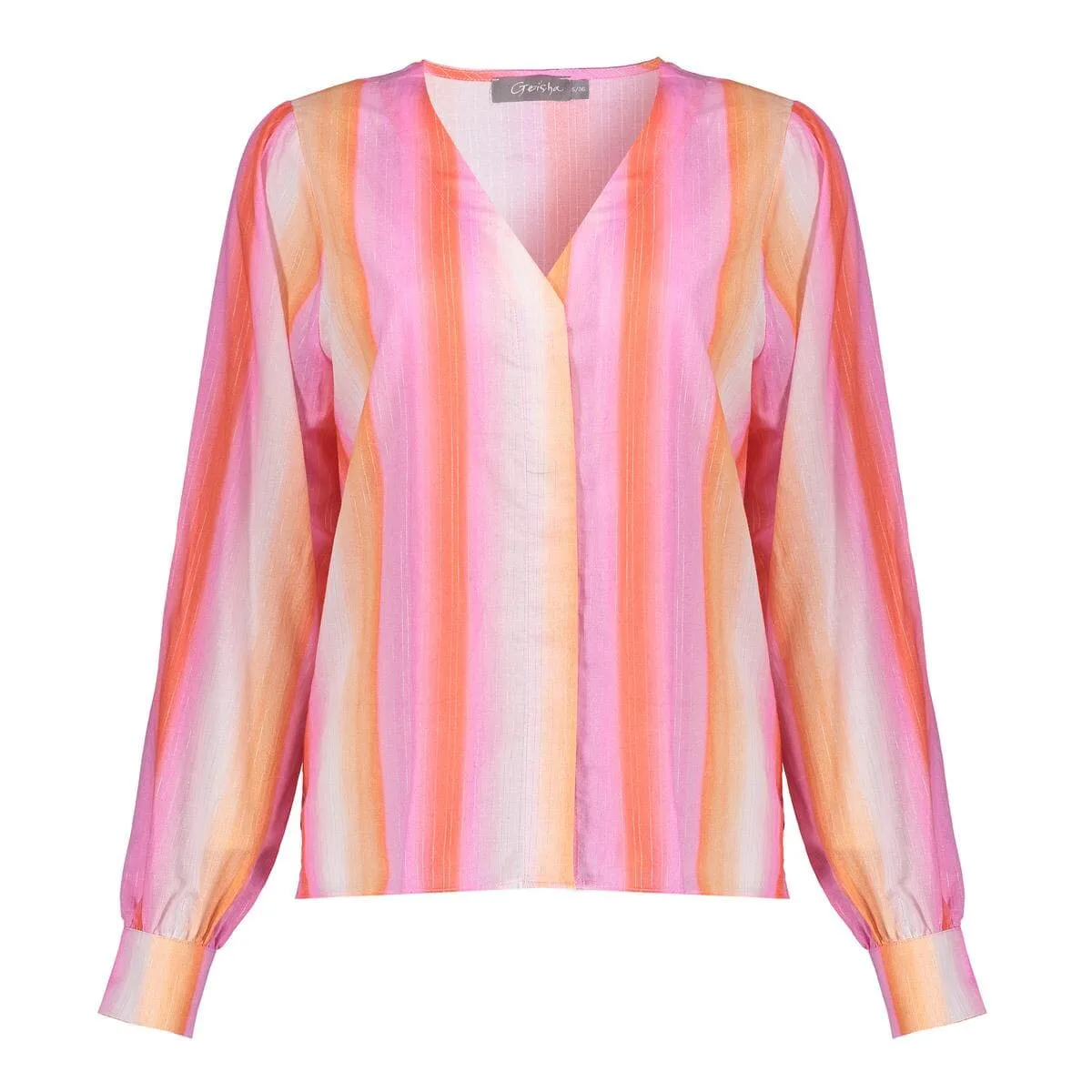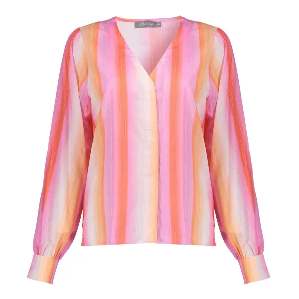 De blouse van Geisha heeft een vrouwelijke uitstraling met een kleurrijk streeppatroon. Uitgerust met een elegante V-hals en lange mouwen met knoopmanchetten, biedt deze blouse een stijlvolle en comfortabele optie voor elke gelegenheid. Perfect voor wie van een frisse, modieuze look houdt.