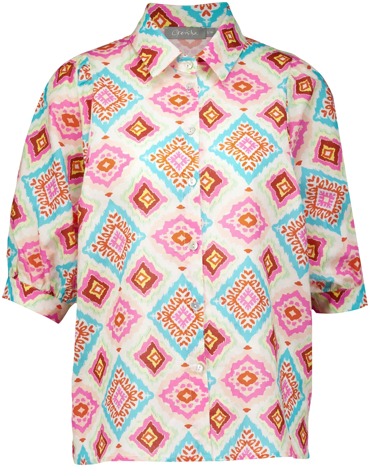 De Blouse 3/4 sleeve van Geisha is een trendy dames top met een bohemian stijl. Het grafische patroon in levendige kleuren en de opstaande kraag met knoopsluiting geven een speelse uitstraling. De losse pasvorm en de 3/4 mouwen met manchetten maken het comfortabel.