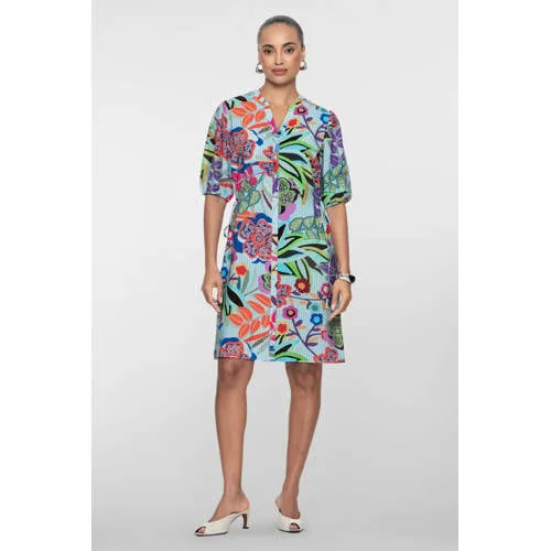 Frisse kleuren en een vrouwelijke snit komen mooi samen in deze blousejurk van Geisha in blauw/groen met all over print. De soepel vallende stof en middel-lange lengte geven een verzorgde uitstraling, terwijl de half lange pofmouwen voor een modern accent zorgen. Ideaal voor zomerse dagen waarop je je graag netjes maar toch ontspannen wilt kleden.Details die het verschil maken Blousejurk in middel-lange lengte, valt mooi rond de knie All over print in blauw/groen met een levendig dessin en rustige kleurstelling Half lange pofmouwen geven extra volume en een eigentijdse touch V-hals met knoopsluiting aan de voorkant voor makkelijk aan- en uittrekken Gemaakt van 85% viscose, 15% polyamide voor een luchtig en soepel gevoel Geen zakken voor een slanke, gladde lijn langs het lichaam Geschikt voor de zomercollectie, licht om te dragen op warme dagenStyling voor werk en vrije tijdDeze zomerjurk past goed op kantoor met nette sandalen en een subtiele ketting. In je vrije tijd combineer je de jurk eenvoudig met witte sneakers of slippers. De V-hals laat ruimte voor een fijne ketting en door de blousestijl kun je de bovenste knoopjes open laten voor een meer ontspannen look.Geisha: eigentijdse stijl met oog voor detailGeisha staat bekend om actuele collecties met een herkenbare pasvorm en doordachte prints. De ontwerpen sluiten aan bij het dagelijkse leven, met items die je zowel naar je werk als in het weekend kunt dragen. Met deze jurk haal je een praktisch kledingstuk in huis dat seizoen na seizoen stijl en draaggemak combineert.Een veelzijdige zomerjurk die je garderobe direct een frisse toevoeging is.