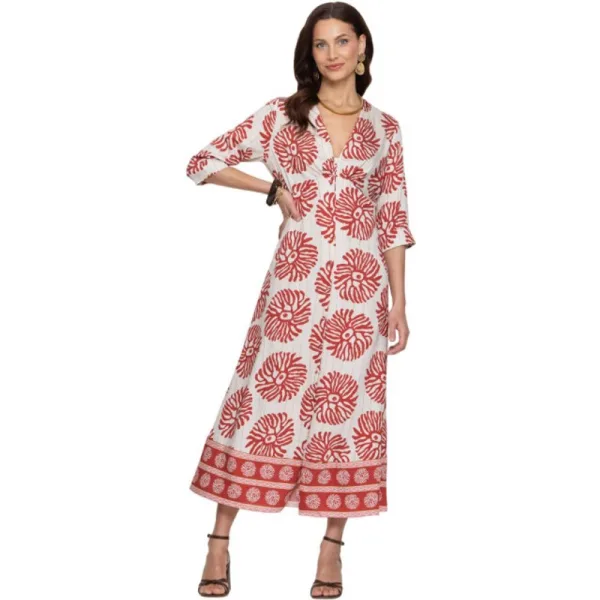 Deze lange damesjurk van Geisha is uitgevoerd in ecru met een terra oranje-bruine print. Het model heeft een lage V-hals, is geheel doorknoopbaar en heeft een verhoogde taillenaad. De onderkant is afgewerkt met een contrasterende rand, wat de jurk een verzorgde uitstraling geeft. De mix van viscose en polyamide sluit aan bij het vloeiende karakter van het ontwerp. Mooi met een eenvoudige sandaal voor een rustige, zelfverzekerde stijl.