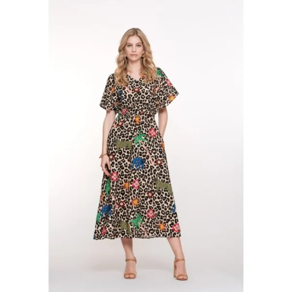 Deze prachtige zand dessin jurk is een must-have voor elke vrouw! De jurk is gemaakt van 85% viscose en 15% polyamide, waardoor het zacht aanvoelt en comfortabel is om te dragen. De midi lengte en het A-lijn silhouet maken het een flatterende keuze voor elke lichaamsvorm. De opvallende print geeft de jurk een speelse en trendy uitstraling. Ideaal voor zowel een dagje uit als een avondje uit, deze Geisha dames jurk is een veelzijdige aanvulling op je garderobe. Shop nu deze geweldige jurk en straal als nooit tevoren!