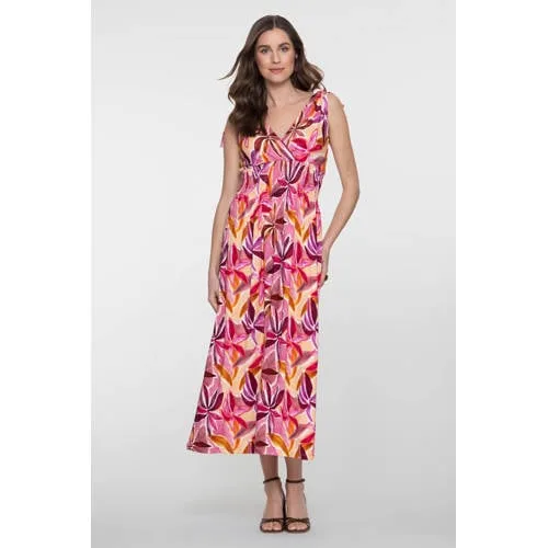 Deze Geisha maxi zomerjurk met bloemenprint geeft je garderobe eenvoudig extra kleur en print. De lange, mouwloze jurk is uitgevoerd in roze/geel met een speelse bloemenprint, geschikt voor zonnige dagen. Door de combinatie van 95% viscose en 5% elastaan voelt de stof soepel en zacht aan en valt de jurk losjes langs het lichaam.Details die het verschil maken Lange maxi lengte voor een luchtige pasvorm Mouwloos ontwerp, prettig op warme zomerdagen V-hals die het decolleté subtiel accentueert Elastische tailleband met smockwerk voor een comfortabele, aansluitende pasvorm Gemaakt van 95% viscose en 5% elastaan, voor een zachte touch en lichte stretch Bloemenprint in roze/geel, passend bij een zomerse stijl Zonder zakken voor een slanke, gestroomlijnde vormZomerse jurk voor elke dagDeze maxi jurk is geschikt voor uiteenlopende momenten. Draag de jurk met sandalen voor een dag in de stad of combineer met een lichte cardigan voor een etentje op het terras. De elastische tailleband zorgt dat de jurk de hele dag prettig blijft zitten.Geisha: aandacht voor print en pasvormGeisha ontwerpt dameskleding met opvallende prints en doordachte pasvormen. De collecties worden samengesteld met oog voor detail, waardoor je kledingkast items bevat die goed met elkaar te combineren zijn.Een luchtige maxi jurk die je in de zomer vaak uit de kast pakt.