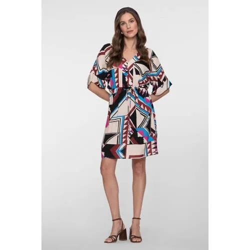 Ga voor een vrouwelijke en moderne look met deze Geisha midi jurk met grafische print. De jurk valt op door de kleurrijke, grafische print in multi kleur en de elegante midi lengte. Gemaakt van 100% viscose, waardoor de stof soepel langs je lichaam valt en licht aanvoelt, ideaal voor het voorjaar en warme dagen.Details die het verschil maken Midi lengte die rond de knie valt voor een verfijnde uitstraling Korte, rechte mouwen voor een luchtig en comfortabel gevoel V-hals die het decolleté subtiel accentueert Zonder sluiting, zodat je de jurk eenvoudig aantrekt Gemaakt van 100% viscose, een zachte en gladde stof Grafische all-over print in multi kleur voor een moderne look Geen zakken voor een mooie, gladde valling langs het lichaamGeschikt voor werk, weekend en vakantieDeze jurk past makkelijk in je dagelijkse garderobe. Combineer met sandalen en een lichte jas voor een dag op kantoor, of draag met sneakers en een denim jack voor een ontspannen weekend. Door de middel lange lengte voelt de jurk geschikt voor zowel werk als vrije tijd en de jurk gaat net zo makkelijk mee in je koffer voor een citytrip.De herkenbare stijl van GeishaGeisha staat bekend om eigentijdse mode met aandacht voor prints, kleuren en vrouwelijke pasvormen. De collectie speelt in op trends, maar blijft draagbaar voor elke dag. Met deze jurk haal je een item in huis dat aansluit bij de herkenbare stijl van Geisha en dat je seizoen na seizoen met plezier uit de kast pakt.Een moderne jurk met grafische print die je snel uit de kast pakt als je zonder nadenken goed gekleed de deur uit wilt.