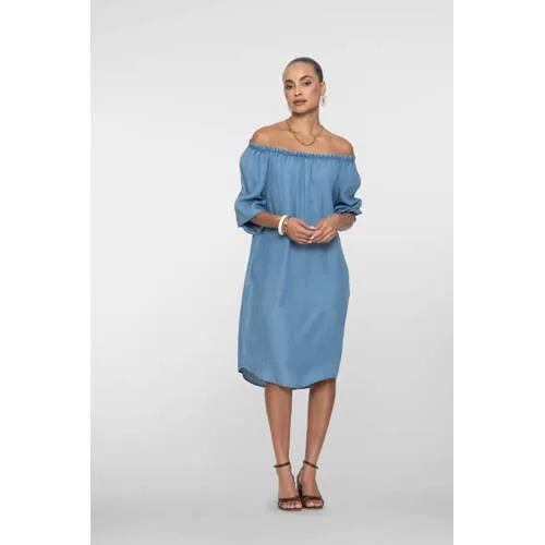 Deze off shoulder midi jurk in medium blue denim van Geisha is een lichte en vrouwelijke keuze voor warme dagen. Door de schoudervrije halslijn en de soepele stof krijgt je outfit direct een zomerse uitstraling. De middel-lange lengte en driekwart mouwen zorgen voor een ontspannen, maar verzorgde look die je makkelijk naar je eigen stijl vertaalt.Lichte denimlook met soepele val Gemaakt van 100% lyocell, een zachte stof met een gladde touch die prettig aanvoelt op de huid Medium blue denim kleur voor een frisse, casual uitstraling Off shoulder kraagvorm legt de schouders subtiel bloot Middel-lange lengte die rond de knie valt, geschikt voor alledaags gebruik en vrije tijd Driekwart mouwen bieden net wat extra bedekking, ideaal voor lente en zomer Zonder sluiting, je trekt de jurk eenvoudig over het hoofd aan Effen design, makkelijk te combineren met sandalen, gympen of espadrillesIdeaal voor warme dagenDeze jurk is een fijne basis voor zonnige dagen in de stad, op vakantie of tijdens een etentje op het terras. Draag er platte sandalen onder voor een relaxte look of kies voor een sleehak voor een iets gekledere uitstraling. Een kleine schoudertas en minimalistische sieraden maken je outfit compleet.Geisha damesmodeGeisha staat bekend om eigentijdse dameskleding met een vrouwelijke uitstraling. Het merk werkt met doordachte details, actuele kleuren en comfortabele pasvormen, zodat de kleding prettig draagt in het dagelijks leven. Met deze jurk voeg je een luchtig en veelzijdig item toe aan je garderobe.Een fijne keuze als je op zoek bent naar een lichte zomerjurk met een denimlook en een vrouwelijke uitstraling.