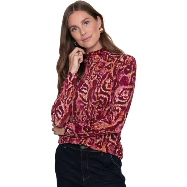 Deze Geisha top in levendig rood trekt meteen de aandacht met een speelse print waarin donkerrood, roze en beige samensmelten; de zachte viscose met stretchy elastane volgt je bewegingen en zorgt voor een soepel gevoel op de huid. De normale lengte en pasvorm sluiten ontspannen aan, waardoor je hem gemakkelijk met een vest of jase combineerd en de opstaande boord bij de hals geeft een nette, toch casual toets.