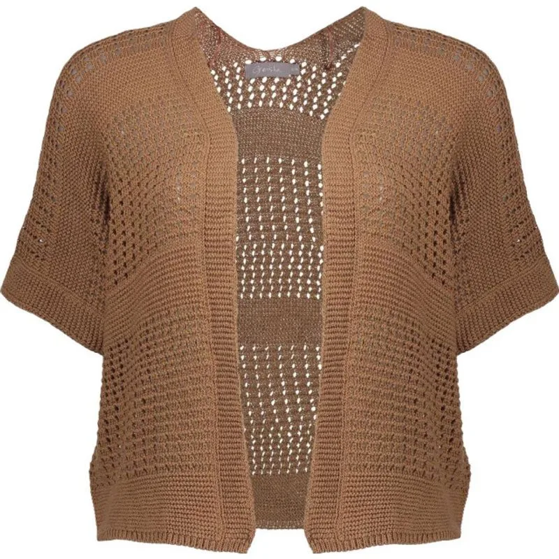 Dit gebreide vest van Geisha in warm chocoladebruin is gemaakt van een zachte mix van acryl en katoen en voelt licht en luchtig aan op de huid. Het fijngaren is verwerkt in een ajourpatroon dat net genoeg transparantie geeft om een speels detail toe te voegen, terwijl de iets kortere lengte het silhouet fris en modern houdt. Het losse model valt natuurlijk langs je lichaam en geeft ruimte om een top of T-shirt te laten zien, zonder dat het vormeloos wordt. Met korte mouwtjes is het gemakkelijk over andere lagen te dragen en biedt het precies de ontspannen uitstraling die je zoekt bij casual en nette combinaties. Door de normale pasvorm sluit het vest moeiteloos aan bij verschillende stijlen, en het zachte materiaal voelt prettig aan. Het ontwerp heeft geen sluiting, waardoor je het open laat hangen voor een nonchalante look.