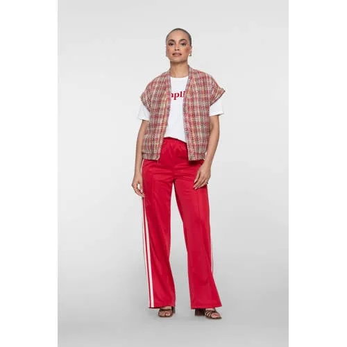 Ga voor een ontspannen maar verzorgde look met deze Geisha track pants in rood met witte details. De broek heeft een wide leg pasvorm en valt soepel langs het lichaam, waardoor er een vloeiende lijn ontstaat. De effen rode kleur wordt speels onderbroken door een contrasterende bies langs de zijkant, wat zorgt voor een sportieve touch die toch makkelijk te combineren is.Belangrijke kenmerken van deze track pants Wide leg model voor een losse, rechte pijp met veel bewegingsvrijheid Regular waist die comfortabel in de taille zit en een natuurlijke pasvorm geeft Elastische tailleband voor makkelijk aan- en uittrekken en een meebewegende fit Effen rode kleur met witte contrast bies langs de zijkant voor een sportieve look Gemaakt van 100% polyester, dat licht aanvoelt en soepel om het lichaam valt Lange lengte, passend bij sneakers of sandalen Ontworpen zonder zakken voor een strakke, gestroomlijnde lookNonchalant en toch verzorgdDeze Geisha track pants is geschikt op dagen waarop je comfortabel wilt zijn en toch een verzorgde outfit wilt dragen. Combineer de broek met een eenvoudig T-shirt of top voor een casual look, of met een blouse voor een sportief chic effect.Geisha: eigentijdse mode met oog voor detailGeisha staat bekend om modieuze items met een comfortabele pasvorm en doordachte details. De collecties sluiten aan bij de trends van nu en zijn gemaakt voor dagelijks gebruik, zodat je er elke dag verzorgd uitziet, zonder in te leveren op gemak.Een moderne basisbroek die je garderobe eenvoudig aanvult.