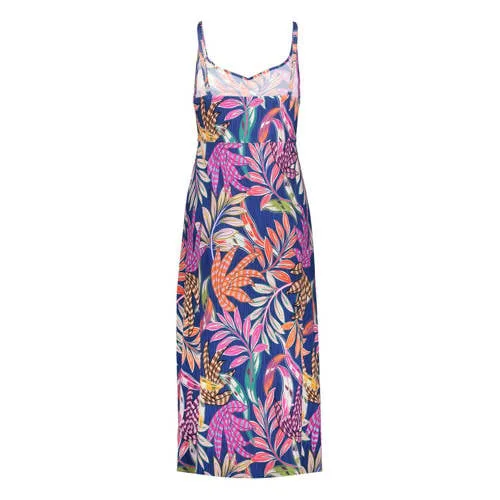 Deze Geisha midi zomerjurk met bladprint is een lichte, zomerse optie voor zonnige dagen. De combinatie van blauw, paars en oranje vormt een rustig geheel bij de all-over bladprint. De soepelvallende stof volgt je bewegingen en het middel-lange model valt net boven of op de knie, afhankelijk van je lengte.Luchtige jurk met fijne details Gemaakt van 95% viscose en 5% elastaan voor een zachte, soepele stof met lichte stretch Midi lengte, passend voor zowel casual momenten als een etentje op vakantie Spaghettibandjes voor een luchtig, zomers gevoel V-hals die de halslijn subtiel accentueert Plooidetails die zorgen voor een vloeiende stofval Zonder sluiting, zodat je de jurk eenvoudig aantrekt Geen zakken voor een glad silhouet Zomerse bladprint in blauw/paars/oranje uit de Feminine collectieVoor zonnige dagen en avondenGeschikt voor warme zomerdagen, een citytrip of een dag aan de boulevard. Draag de jurk met sandalen en een lichte cardigan voor overdag. Voor de avond kun je er gemakkelijk een spijkerjack en sneakers of espadrilles bij combineren.Geisha: vrouwelijke stijlen met een eigen karakterGeisha staat bekend om eigentijdse collecties met aandacht voor print, kleur en pasvorm. De ontwerpen uit de Feminine lijn combineren een vrouwelijke uitstraling met draagbare modellen voor elke dag. Met deze jurk voeg je eenvoudig een veelzijdig item toe aan je garderobe dat je op verschillende manieren kunt stylen.Een zomerse jurk die de hele dag prettig draagt en verzorgd oogt.