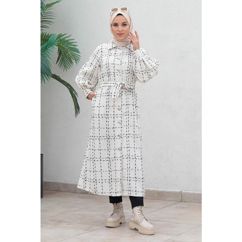 Stofkenmerk: Gemaakt van chanelstof. Productkenmerk: Nieuwe seizoen hijab modeproduct. Het heeft bruikbare knopen aan de voorkant. Er is een zak. De riem is verwijderbaar. De kleur van het product kan verschillen door conceptfoto's. Het model draagt maat 38. Maat 38 Cashmere Jas Maatvoering: Productlengte: 124 cm - Borst: 98 cm - Taille: 100 cm - Heupen: 110 cm Lichaamsmetingen nemen toe met 3 of 4 cm. (Productlengte verandert niet)
