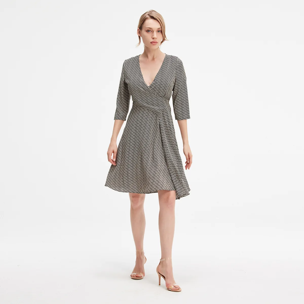 Een asymmetrisch snijstuk met een gedrapeerd wikkeleffect aan de zijkant en een royale wijd uitlopende rokvolume en grafische print. Een veelzijdig item dat 's avonds een chique look voor het kantoor en een elegante stijl geeft. Met zijn aantrekkelijke v -neck en zijn fitte grootte onderstreept de subtiel structuur uw vrouwelijkheid. De wrap -snit is slechts een effect: de jurk sluit handig met een ritssluiting naast. Snijd in een vloeiende fablic met subtiele grafische print. Productdetails: • Vorm: trapeze • Lengte: 96 cm • 3/4 mouwen • v -neck • Linkerkant Zip