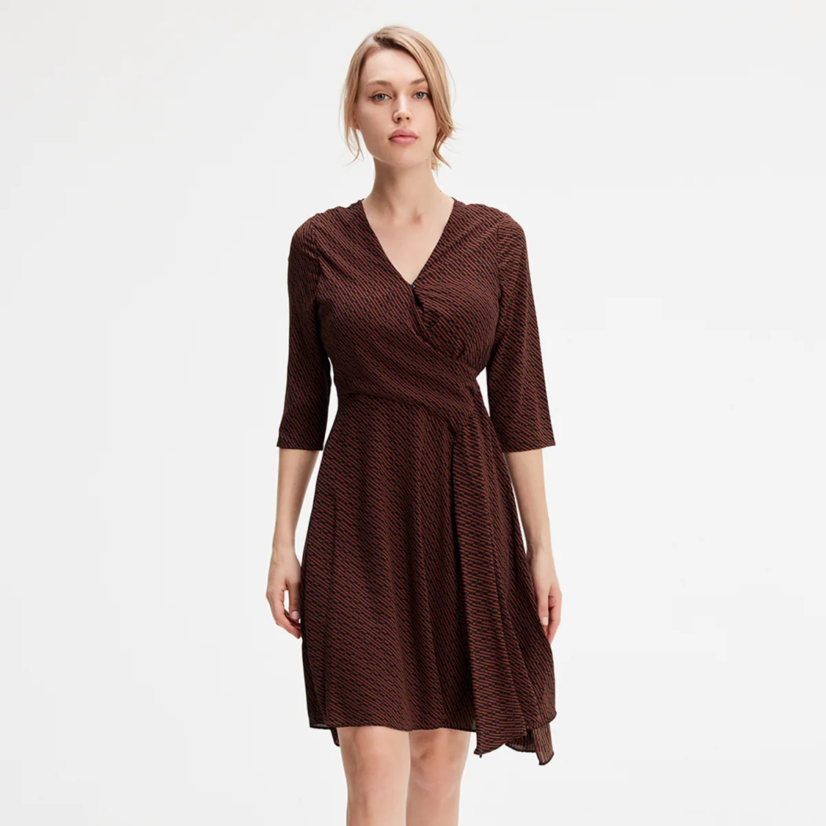 Een asymmetrisch snijstuk met een gedrapeerd wikkeleffect aan de zijkant en een royale wijd uitlopende rokvolume en grafische print. Een veelzijdig item dat 's avonds een chique look voor het kantoor en een elegante stijl geeft. Met zijn aantrekkelijke v -neck en zijn fitte grootte onderstreept de subtiel structuur uw vrouwelijkheid. De wrap -snit is slechts een effect: de jurk sluit handig met een ritssluiting naast. Snijd in een vloeiende fablic met subtiele grafische print. Productdetails: • Vorm: trapeze • Lengte: 96 cm • 3/4 mouwen • v -neck • Linkerkant Zip