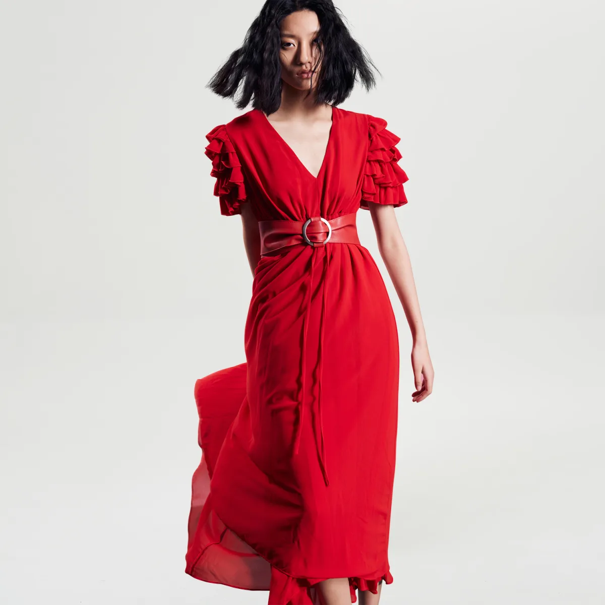 Een statement -stuk dat opvalt met zijn schouders die bestaat uit gelaagde ruches. Vrouwelijk silhouet onderstreept door een hoge verzamelde taille, een aantrekkelijke V -halslijn en een wijd uitlerend volume in een lichte sluier. Een glamoureuze en sculpturale look om te exposeren tijdens je volgende cocktail / avond of bruiloft. Productdetails: • Vorm: trapeze • Lengte: 135 cm • Korte mouwen • V halslijn • Onzichtbare rits aan de linkerkant • Drawstringgordel
