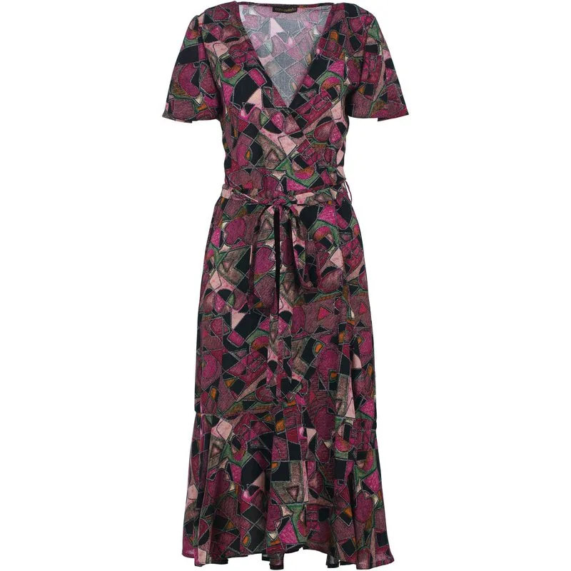 Deze zomerse wikkeljurk is gemaakt van geweven geometrische allure. Het heeft een V-hals en korte ruche mouwen. In de taille zitten bandjes van dezelfde stof. De zoom heeft een ruche van 26 cm. Het kledingstuk heeft een midilengte.