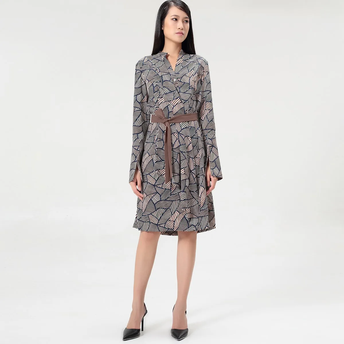 Moeilijk en toch exclusief, deze tuniekjurk is je beste bondgenoot voor een werkdag of een informele bijeenkomst in het hele weekend. Subtiele geometrische vintage print, elegante V-halslijn, brede drapevleep paneel die aan de voorkant loopt. Handig onderstreept op de taille met een gescheiden riemband en verbeterd met verfijnde parelsknoppen op manchetten. Kan tijdens de koele dagen worden gekoppeld aan een paar leggings. Productdetails: Vorm: recht Afzonderlijke riem verstrekt Lengte: 103 cm Lange mouwen V halslijn