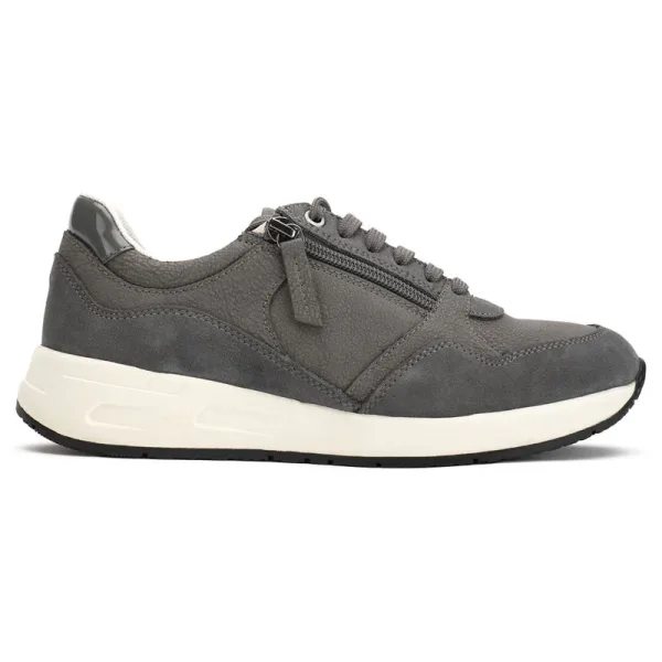 Ervaar ongeëvenaard comfort en stijl met de modieuze Geox Bulmya-sneakers. De grijze leren bovenkant, gecombineerd met contrasterende witte, duurzame rubberen zolen, hebben rits- en vetersluitingen voor een perfecte pasvorm. Geniet de hele dag van gemak met gedempte binnenzolen en een vleugje glamour van de glanzende hak. Val op met de kenmerkende flair van Geox.