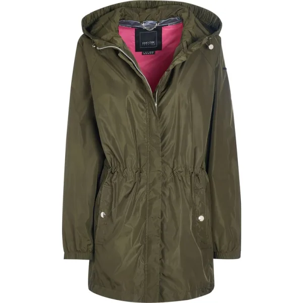 100% polyamide; Geox-jas; Model: W0220LT2506F7115; Hoogwaardige afwerking; Afneembare capuchon; Twee voorzakken; taille met trekkoord; Geox-logodetails