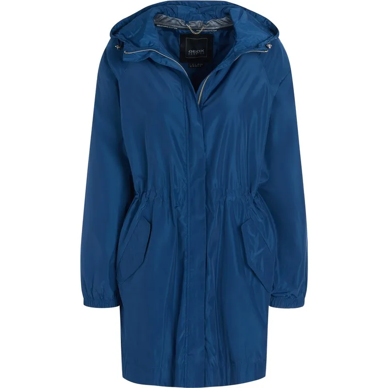 100% Polyester; Geox-jas; Model: W0222FT2609F4490; Hoogwaardige afwerking; Iets nauwsluitend; Opstaande kraag met capuchon en trekkoord; Verborgen tweewegritssluiting; Twee voorzakken, één binnenzak; Een verwijderbaar vak met ritssluiting en riem; Verstelbare taille; Geox-logodetails