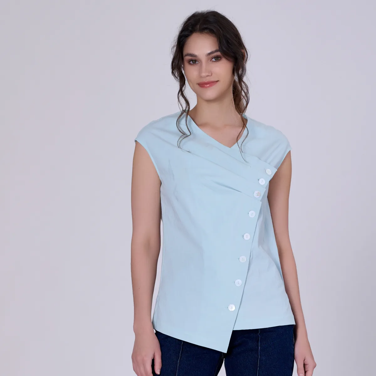 Een top met een unieke asymmetrische structuur, waarbij het rechterzijpaneel aan de voorkant gekruist is en vastgezet is met parelmoerkleurige knopen. Structuur van plooien aan de bovenkant, wat een dynamische uitstraling geeft. Dit kledingstuk is gemaakt van ademende katoenen popeline en is geschikt voor het lente- en zomerseizoen. Deze blouse is geschikt voor casual of semi-formele gelegenheden. Te dragen over een broek of rok, maar kan ook worden geaccentueerd met een riem om de taille te benadrukken. Productdetails: Lengte: 65 cm Model draagt maat 10 Modelhoogte is 5 "7 Vorm: recht Mouwloos (maar schouders bedekt) V halslijn Asymmetrische voorste knopen