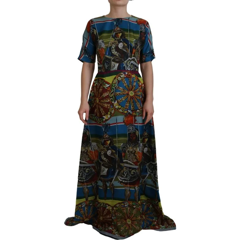 Maak een statement, trek de aandacht en voel je geweldig in deze luxe zijden maxi-jurk. Ervaar ongeëvenaarde elegantie met dit levendige ontwerp van Dolce & Gabbana. De kleurrijke Carretto Siciliaanse wagenprint voegt een vleugje artistieke flair toe aan je garderobe, zodat je opvalt in de menigte. De ronde hals en korte mouwen bieden een comfortabele en flatterende pasvorm, perfect voor elke speciale gelegenheid. Gemaakt van 100% zijden en gevoerd met luxueuze zijden stof, valt deze jurk prachtig en voelt zijdezacht aan op de huid. Maak van elk moment iets onvergetelijks.