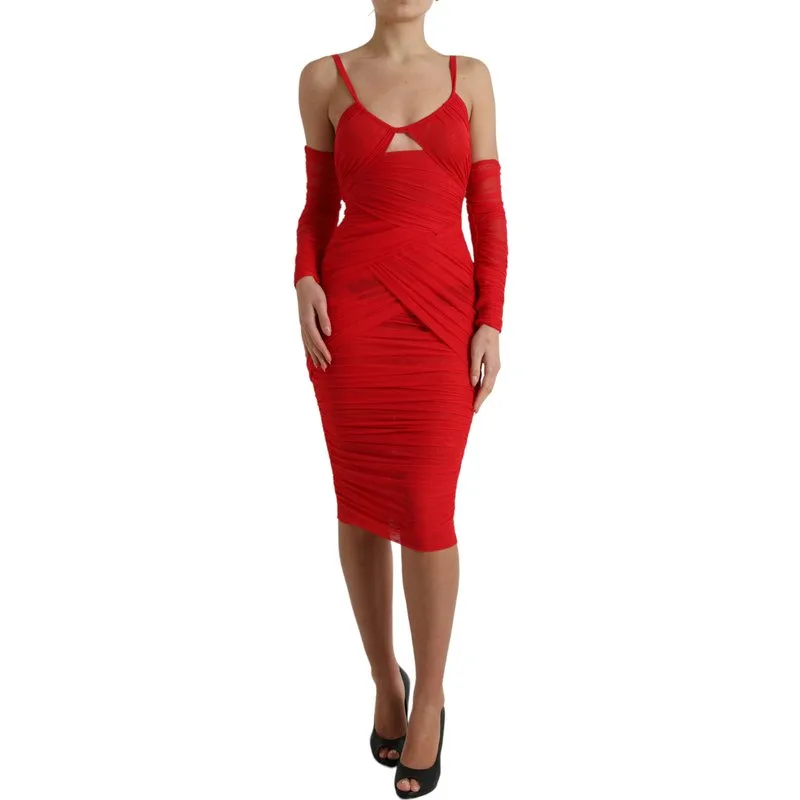Gerepte Mesh Midi-jurk Rode Lange Mouwen Jurk Prijzen