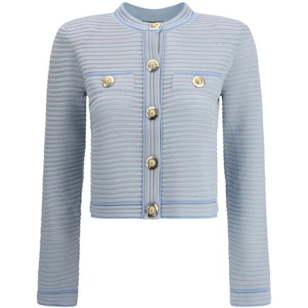 Verhef, verfijn en straal vertrouwen uit. Dit elegante cardigan voegt direct een vleugje verfijning toe aan elke outfit. De ribgebreide textuur zorgt voor een flatterende silhouet. Goudkleurige knopen bieden een luxueuze accent. De lichtblauwe bies zorgt voor een subtiele kleuraccent. Geniet van de comfortabele katoenmix, perfect om te combineren of om alleen te dragen. Het gestructureerde ontwerp zorgt voor een perfecte pasvorm. Alleen chemisch reinigen voor blijvende elegantie. Kleed het op voor avondgelegenheden of combineer het casual voor everyday chic.