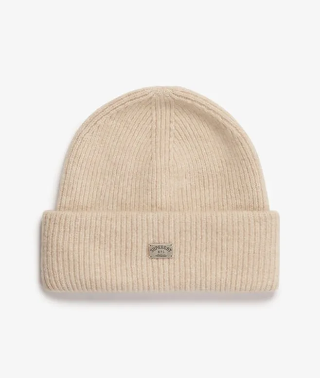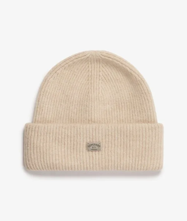 Wolmix Standaard gebreid Omgeslagen boord Metalen Superdry-logolabel Het perfecte item voor kouder weer en een must om toe te voegen aan je gebreide accessoires. De ribgebreide beanie is een luxueuze zachte basic die je winterlook een upgrade geeft in stijl en functionaliteit. Het is een echt accessoire-icoon.