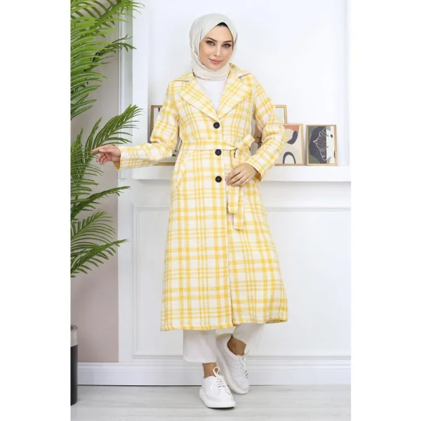 Stofkenmerk: Gemaakt van Chanel-stof. Productkenmerk: Nieuwe seizoens hijab modeproduct. Niet gevoerd. De riem is afneembaar. Er is een zak. Het heeft bruikbare knopen aan de voorkant. De productkleur kan verschillen door conceptfoto's. Het model draagt maat 38. Maat 38 Jasmetingen: Productlengte: 118 cm - Borst: 96 cm - Taille: 92 cm - Heupen: 100 cm. Lichaamsafmetingen nemen met 3 of 4 cm toe. (De productlengte verandert niet.)