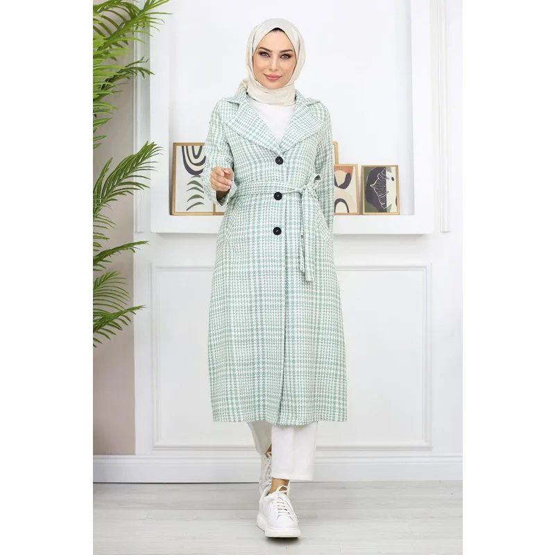 Stofkenmerk: Gemaakt van Chanel-stof. Productkenmerk: Nieuwe seizoen hijab modeproduct. Niet gevoerd. De riem is verwijderbaar. Er is een zak. Het heeft bruikbare knopen aan de voorkant. De kleur van het product kan afwijken door conceptopnamen. Het model draagt maat 38. Maat 38 Jassenmaten: Productlengte: 118 cm - Borst: 96 cm - Taille: 92 cm - Heupen: 100 cm Lichaamsmaten nemen met 3 of 4 cm toe. (Productlengte verandert niet)