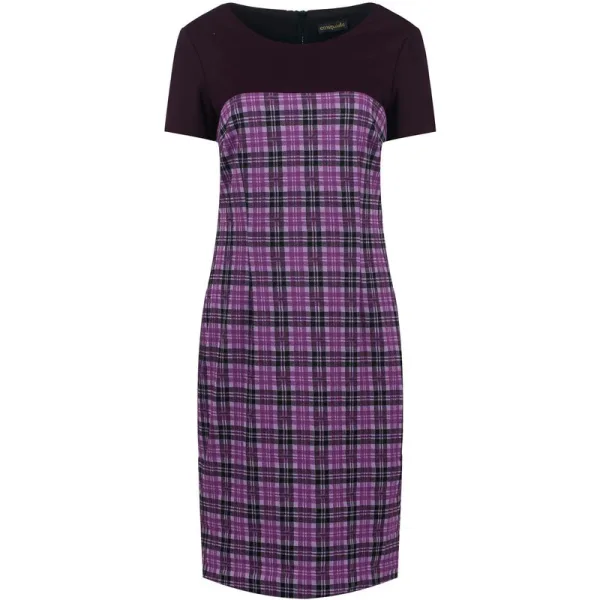This check dress is crafted in shades of mauve with solid black detail at the top. It has short sleeves and a round neckline. Darts at the bust create the perfect fit and there is concealed zip fastening in the back. It is lined. The dress has a fitted silhouette and is knee length. Our model is 176cm and is wearing size 36/S. Measurements for size 36/S (in cm): Shoulder -38, Chest-40, Waist-38, Bottom-46, Sleeve Length-18, Body length-97. 92% polyester-8% elastan + 70%viscose-25%polyamid-5%elastan. Accessories are not included.