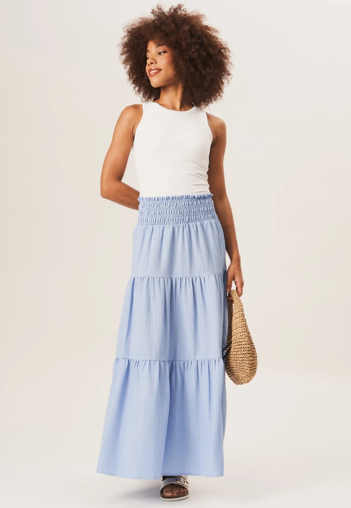 Trek de aandacht in deze stijlvolle gesmokte, vermoeide maxirok. De vloeiende lagen en de gesmokte taille zorgen voor een flatterende en comfortabele pasvorm. Deze rok is perfect voor elke gelegenheid en is een veelzijdige toevoeging aan je garderobe. Blijf trendy en zelfverzekerd met dit modieuze kledingstuk.