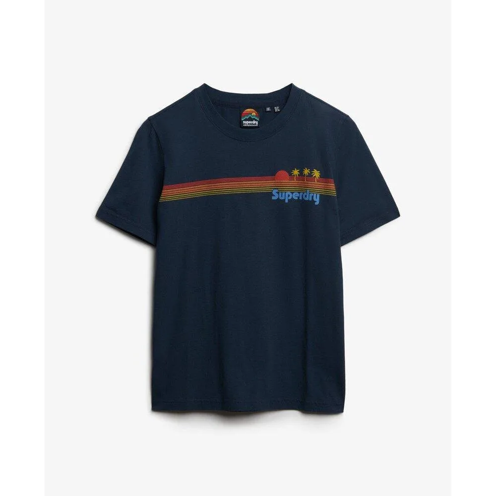 Casual fit – de klassieke snit van Superdry. Niet te strak en niet te ruim. Juist goed. Kies je gebruikelijke maat. Ronde hals en korte mouwen. Print op de borst. Etiket op de mouw. Geef je casual outfits een iconische stijl met het gestreepte t-shirt met regenboogmotief. Perfect om je authentieke garderobe een opfrisbeurt te geven, dit stuk, versierd met een levendig en speels motief, heeft een casual snit voor meer combinatiemogelijkheden.