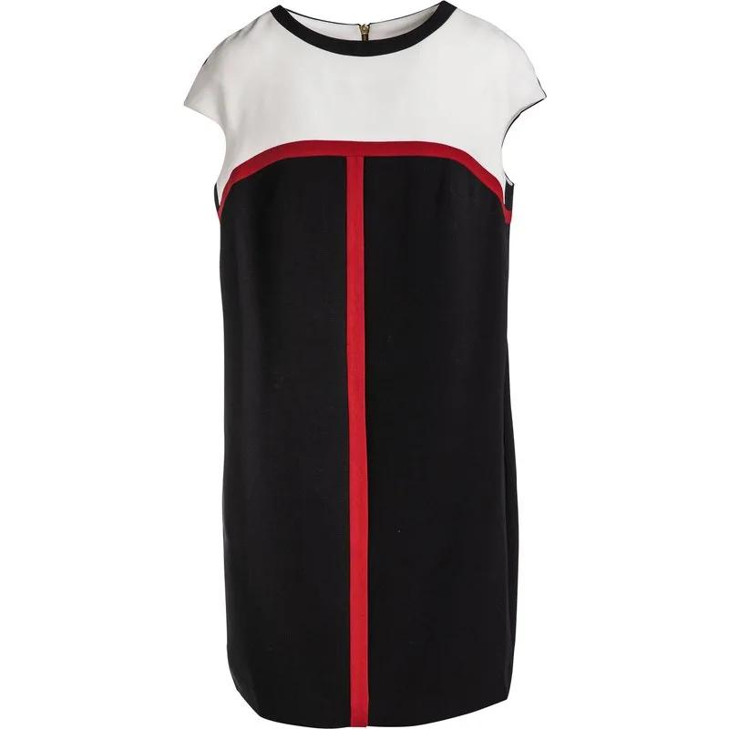 Mouwloze winterjurk. Ronde halslijn met een decoratieve zwarte bies bij de hals. Colourblock design met wit bovenaan en zwart onderaan. Contrasterende rode strepen op het lijfje. Goudkleurige ritssluiting van 50 cm aan de achterkant. Twee binnenzakken aan de zijkanten met contrasterende rode binnenkant. Volledig gevoerd. Ontspannen zaksilhouet. Lengte jurk voor maat 38: 95cm. Extra stof aan de zoom maakt het mogelijk om tot 4 cm te versoepelen.