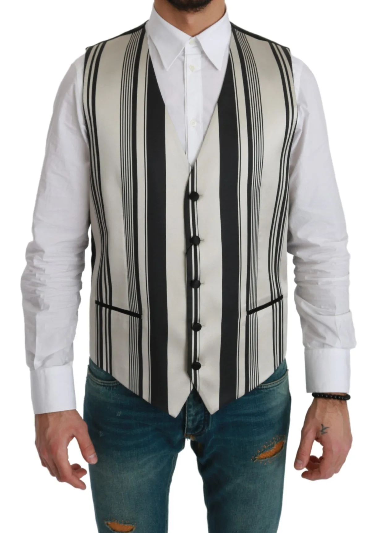 Bepaal je uitstraling, trek de aandacht en straal vertrouwen uit. Dit zijden vest voegt een vleugje verfijnde elegantie toe aan elke formele outfit. Gemaakt van luxueus 100% zijde, zorgt het tijdloze verticale streepjespatroon ervoor dat je altijd een verfijnde indruk maakt. De comfortabele pasvorm staat moeiteloze beweging toe, terwijl de knoopsluiting zorgt voor een veilige en verzorgde afwerking. Perfect voor bruiloften, galadiners of om je dagelijkse kostuum naar een hoger niveau te tillen, belichaamt dit vest tijdloze stijl en onberispelijke kwaliteit. Een werkelijk substantiële toevoeging aan de garderobe van de moderne gentleman.