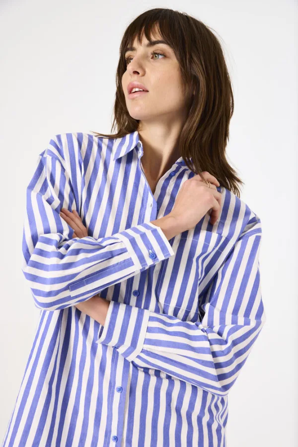 Gestreepte blouse met borstzakje. Een trendy item, ideaal voor dit seizoen! Deze blouse heeft lange mouwen, een kraagje, een knoopsluiting en een loose fit. Dit item is gemaakt van 100% katoen. Better Cotton is een initiatief dat zich wereldwijd inzet voor betere omstandigheden in de katoenindustrie.